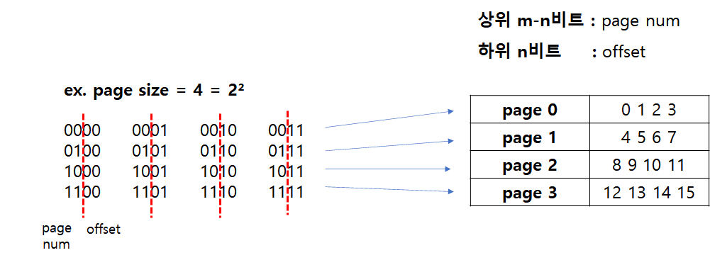 ex. logical address space = 2^m, page size = 2^n 일 때