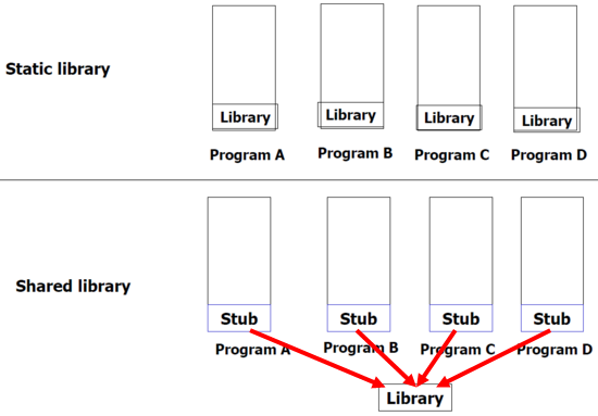 -> 각각의 프로그램에 library를 포함시키지 않으므로 메모리를 효율적으로 사용 가능.