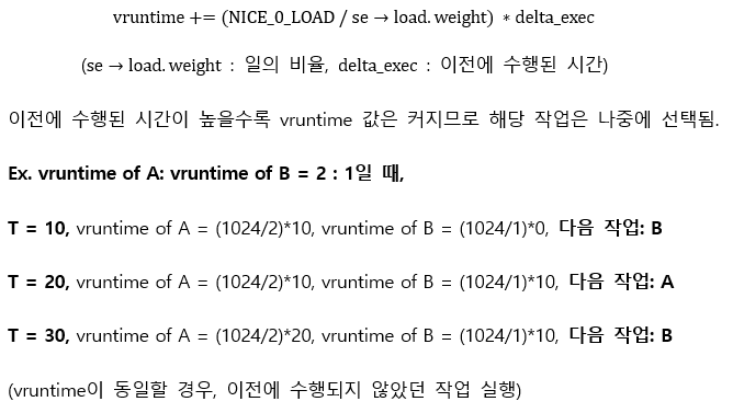 다음 수행할 작업으로 가장 낮은 vruntime값을 가지는 작업을 선택.