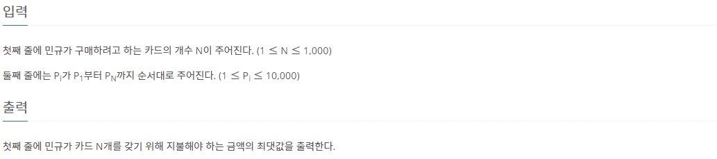 첫째 줄에 민규가 구매하려고 하는 카드의 개수 N이 주어진다. (1 ≤ N ≤ 1,000) 둘째 줄에는 Pi가 P1부터 PN까지 순서대로 주어진다. (1 ≤ Pi ≤ 10,000)